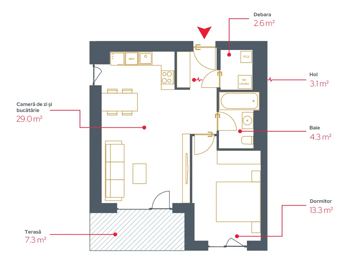 • 1. Living și Bucătărie 29.0 mp